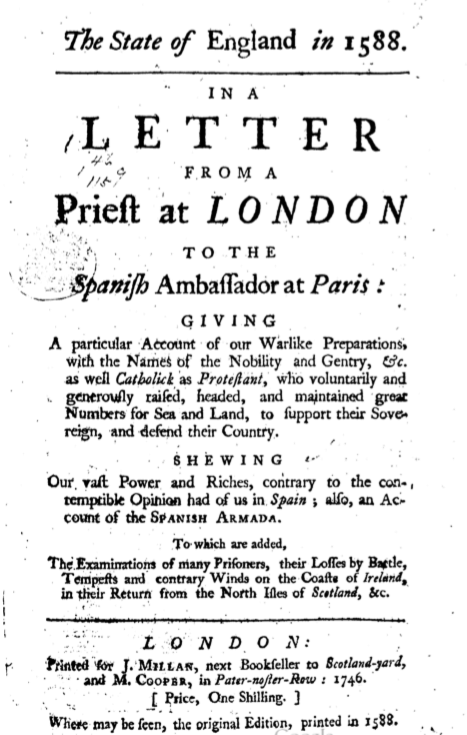 “La copia de una carta”, escrita por Burghley y publicada a finales de septiembre de 1588, simula ser la carta de un clérigo católico inglés al embajador de España en París y tuvo en realidad tres borradores distintos.